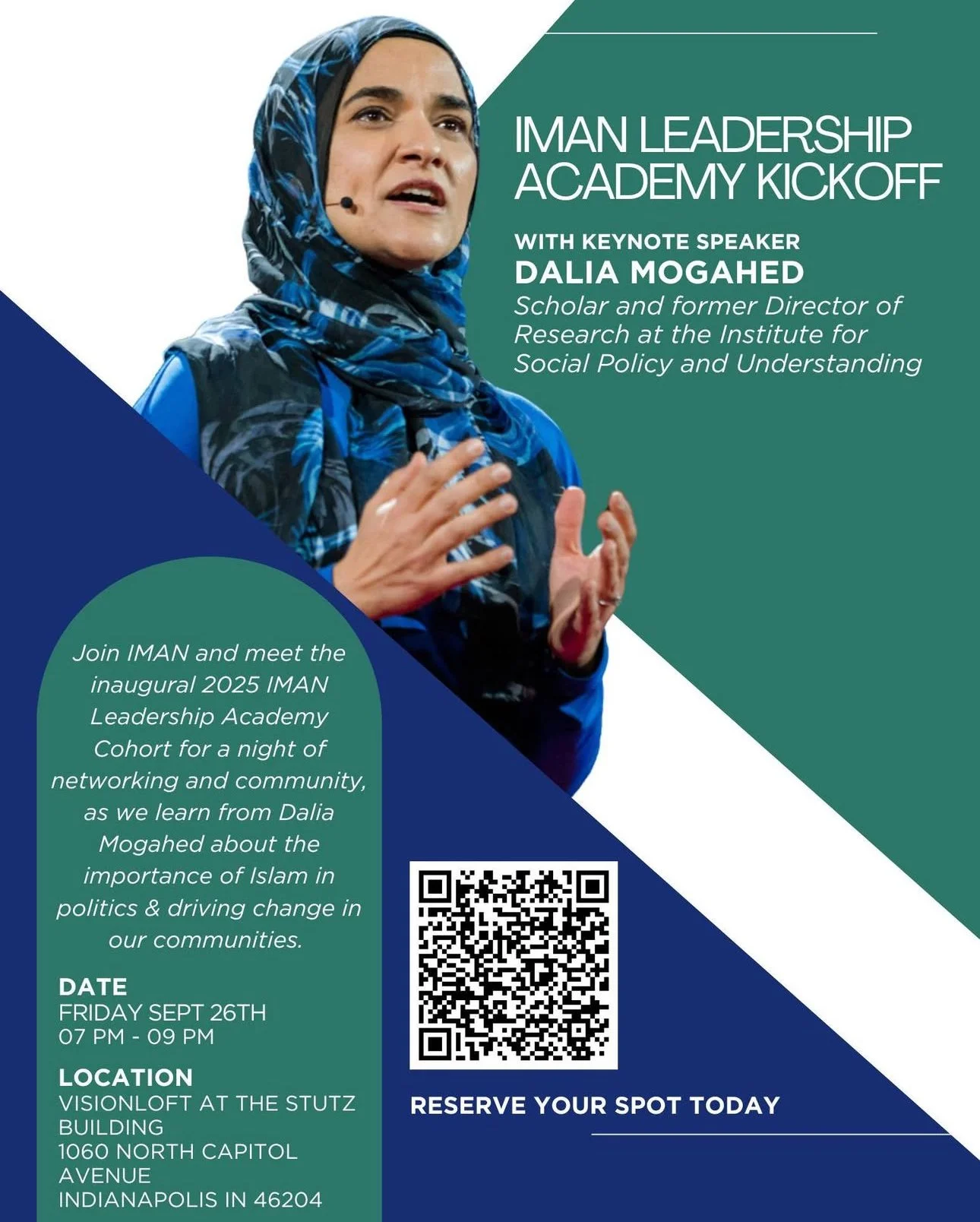 Join us Friday September 26th to meet the inaugural cohort for the IMAN Leadership Academy. You’ll get to meet Muslim leaders and involved community members from all across Indiana while also hearing from our keynote speaker, Dalia Mogahed. Spots are limited so get your FREE tickets and RSVP soon!